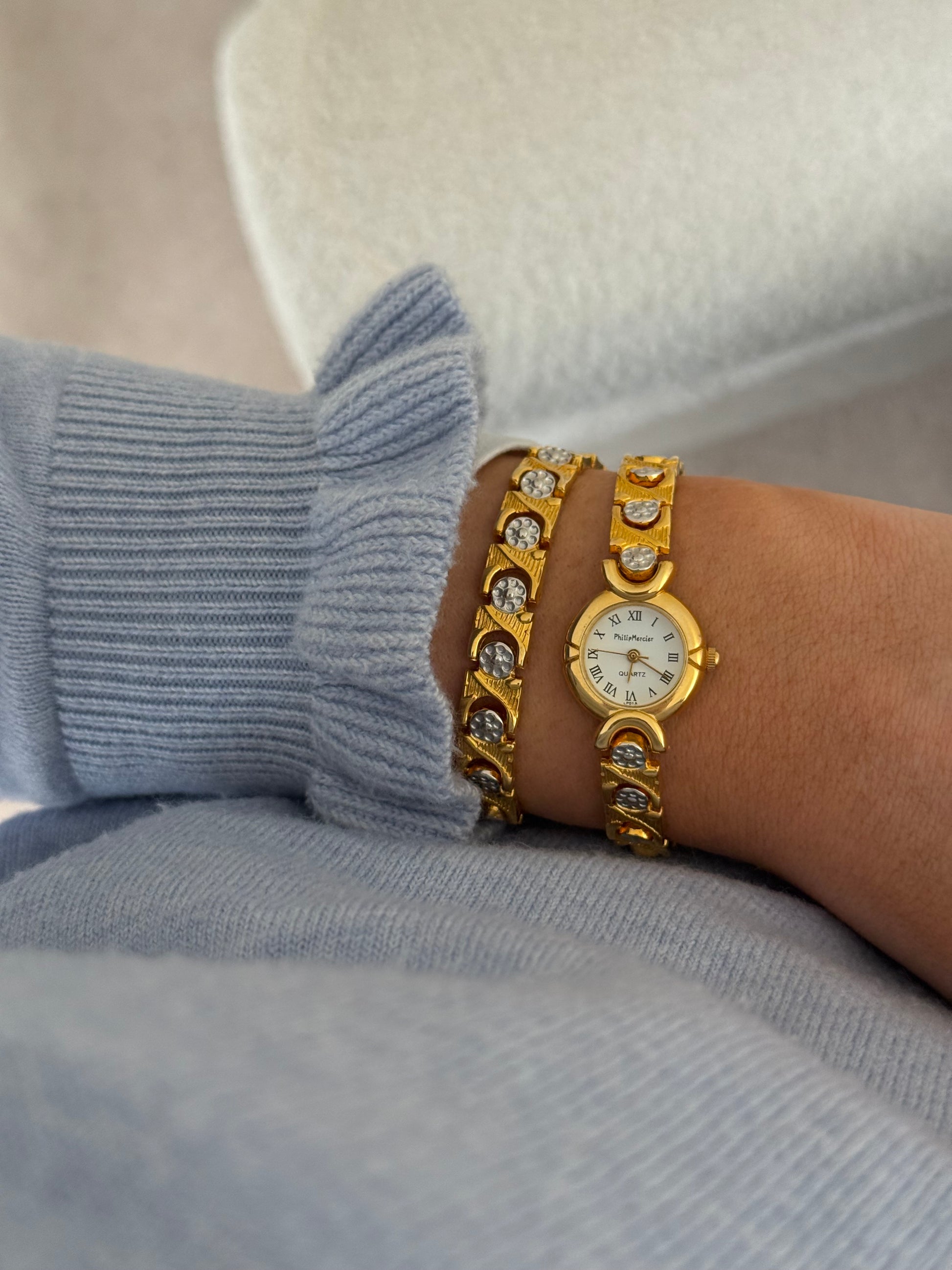 A striking vintage Philip Mercier set, beautifully crafted to combine timeless elegance with a touch of brilliance. The refined gold tone watch features a classic round dial with Roman numeral markers, offering a graceful and traditional aesthetic. Its delicate proportions are perfectly balanced by the accompanying bracelet, designed with sculptural gold links and shimmering crystal accents that catch the light with every movement.
